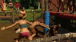 The players are placed into a small arena and made to fight over three balls. These balls are then passed to other players on a platform who have to shoot them into a basket with no backboard. In the pit things get aggressive as players struggle for control of the ball, for example we saw Jerri get her face smashed into a wooden pole and JT body slam Coach when it was run during Heroes vs Villains.